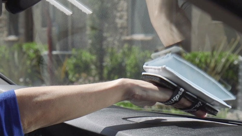 - If glass has stubborn haze or smudges, spray a light misting of water or glass cleaner directly ONTO the microfiber sponge before wiping inside of windshield.